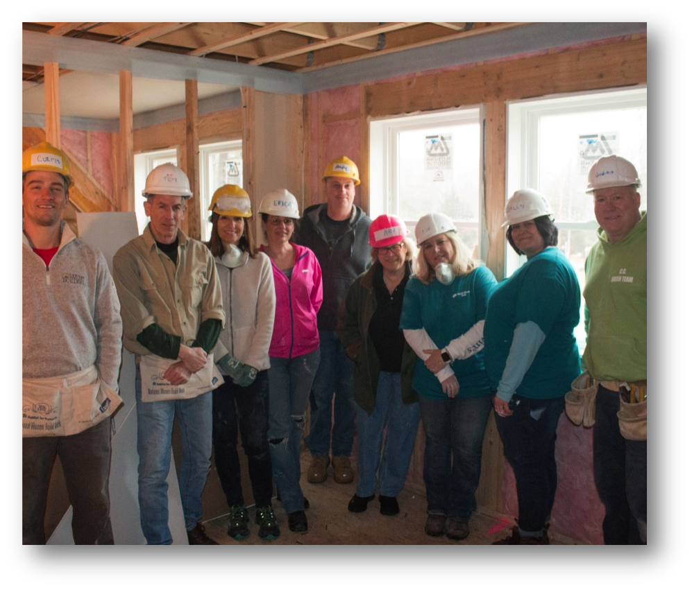 A team from South Shore Bank, headquartered in Weymouth, offered its time and talent to the South Shore Habitat for Humanity home build in Duxbury. The team included Curtis Webb, Tom Gillen, Carol Powell, Erica Calligan, Andrew Pope, Amy Geogan, Lee Page, Sally Hughes, Glenn Tattrie. They worked with SSHH family partners on the multi-family project on Feinberg Bog Road.